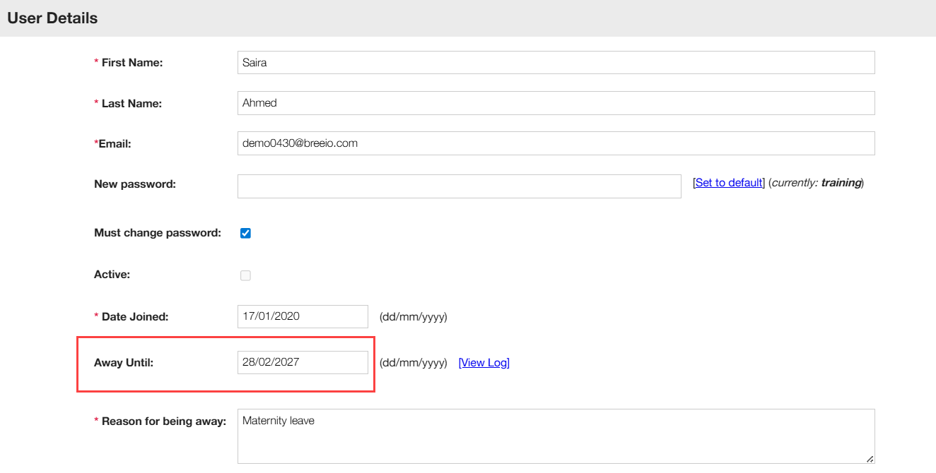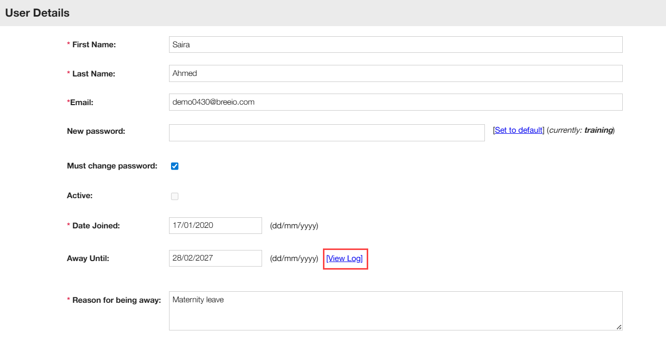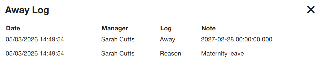 You can view a User's 'Away until' history by clicking on the 'View Log' link:
