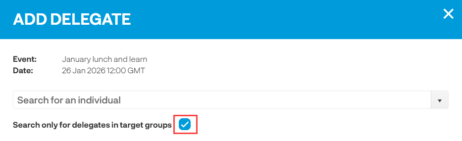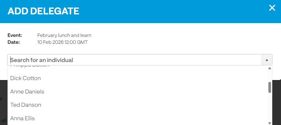 Delegates can add themselves onto independent events however if you want to add them you can do this by clicking on the ‘Add delegate’ button on the event.