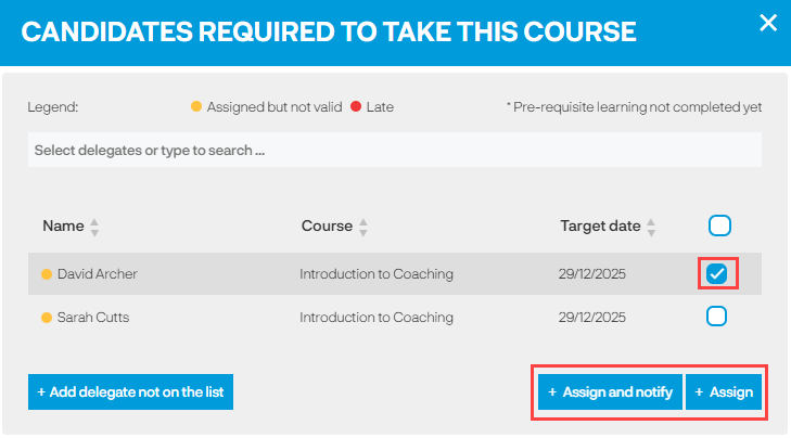 The list of delegates are learners who have an open assignment to the course, click in the tick box next to the delegate(s) you want to add onto the event. You can choose to Assign the delegate(s) to the event or to Assign and notify them.