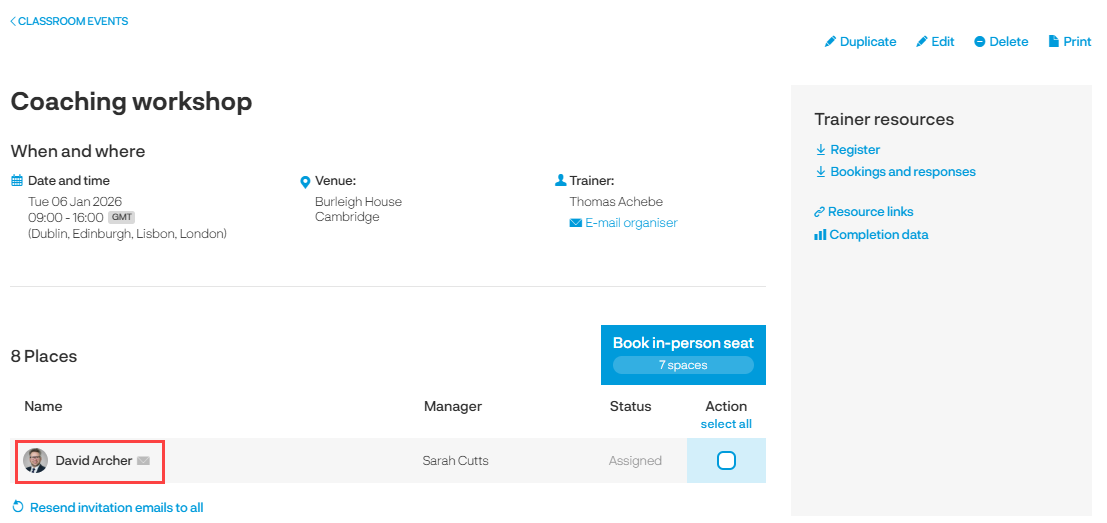 Search for the learner you want to add. You will be provided with details of the impact of adding the delegate to the event for example that the course will be assigned to the learner and they will be required to complete all modules in the course.