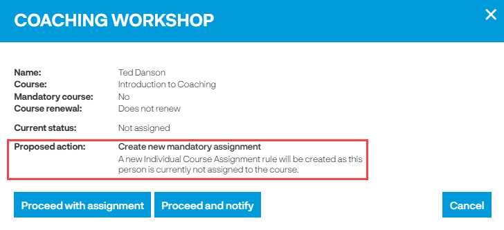 Ted is not currently assigned to the Introduction to Coaching course so by adding Ted to the Coaching Workshop a new individual course assignment rule will be created.