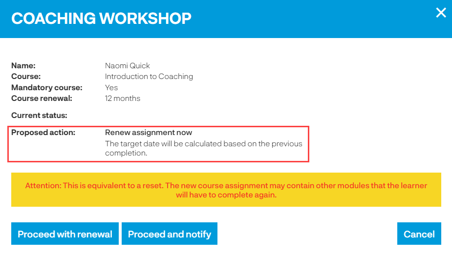 Naomi has a completion on the Introduction to Coaching course and by adding her to the event the full course will be assigned to her again. It's a 12 month renewal course therefore you might want Naomi to join the workshop a bit earlier than her renewal is due.