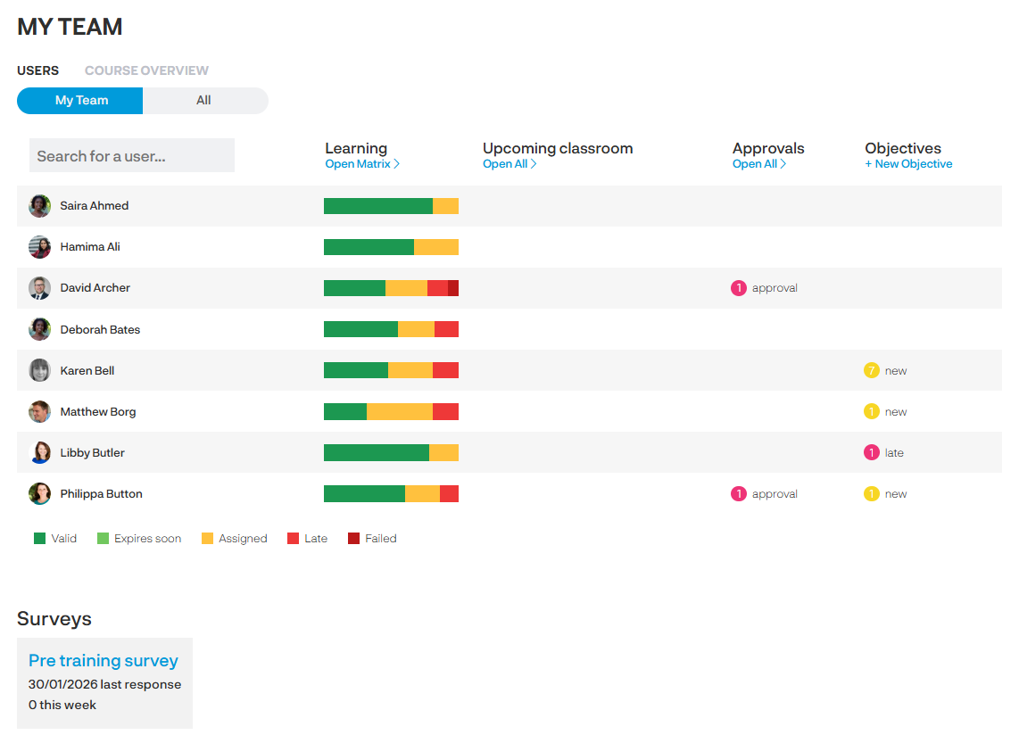 The manager will get a great visual of the validity of the courses that have been assigned to each individual, dates of classroom events if there are any approvals required, and outstanding objectives.